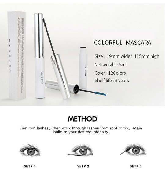 ???12 Colors??? It has 12pcs vivid colors: black, white, blue, green, violet, yellow, red coral, dark red, pink. Colored mascaras make you have shinning big eyes, releasing your charm. Whata??s more, you could have different mood in week, sticking you out from the crowd.